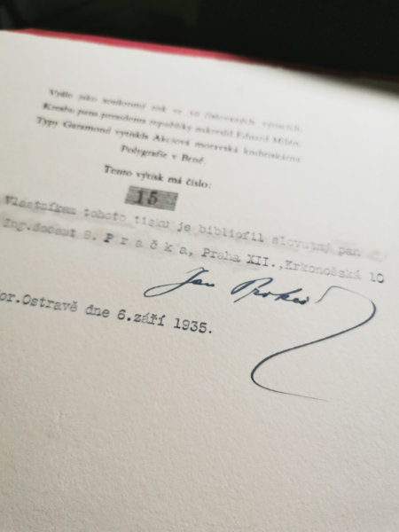 Vyšlo jako soukromý tisk ve 30 číslovaných výtiscích. Tento výtisk má číslo 15. Vlastníkem tototo tisku je bibliofil svovutný pan Ing. Docetn B. Pračka, Praha XII., Krkonošská 10 a podpis Jan Prokeš. Jan František Prokeš je nejvýznamější starosta Ostravy, který vtiskl Ostravě moderní tvář. Postavil Novou radnici. Dům umění, Masarykův ústav. V knize je vročení 6. záři 1935. Pár měsíců poté starosta Prokeš zemřel.