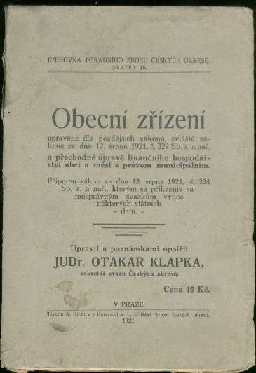 Obecní zřízení podle zákona 329 Sb. ze dne 12. srpna 1921Detailní informace