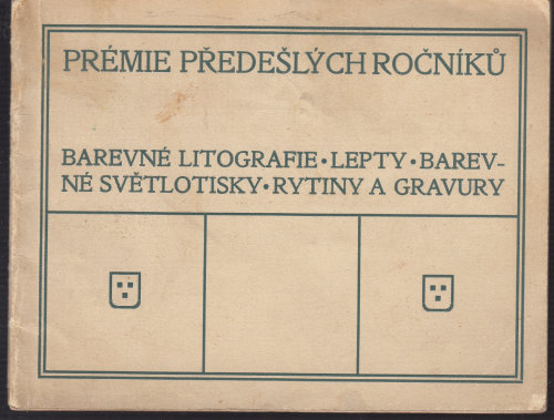 malý sešitek ve které jsou zobrazeny prémie, které dostávaly členové spolku Krasoumná jednota v Rudolfinu, čb reprodukce litografii, leptů, světlotisků, rytin a gravur včetně prodejných cen